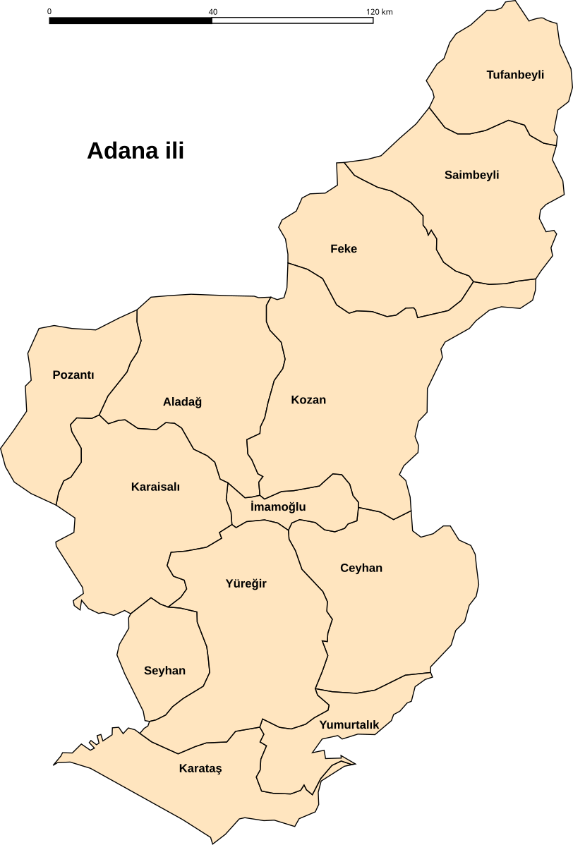 Aladağ, Ceyhan, Çukurova, Feke, İmamoğlu, Karaisalı, Karataş, Kozan, Pozantı, Saimbeyli, Sarıçam, Seyhan, Tufanbeyli, Yumurtalık, Yüreğir